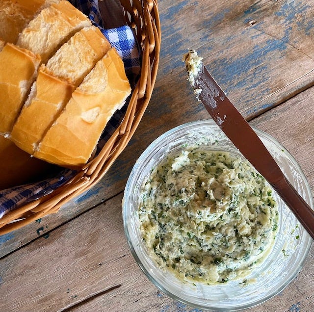 Coloque todos os ingredientes numa tigela e misture bem com uma colher, formando uma pastinha bem perfumada. Corte o pão francês por cima, criando várias fatias mas sem cortar até o final do pão. Passe a pastinha de alho entre os cortes, espalhando bem pela parte do miolo em cada fatia. Por cima, dê uma pincelada em todo o pão com a pastinha e leve ao forno pré-aquecido ou para a churrasqueira. Se usar o forno, cuidado para não deixar queimar embaixo. O ideal é que a temperatura do forno permita que o pão fique um tempinho lá para que a pastinha e o alho possam impregnar no pão sem sair do forno ainda cru.